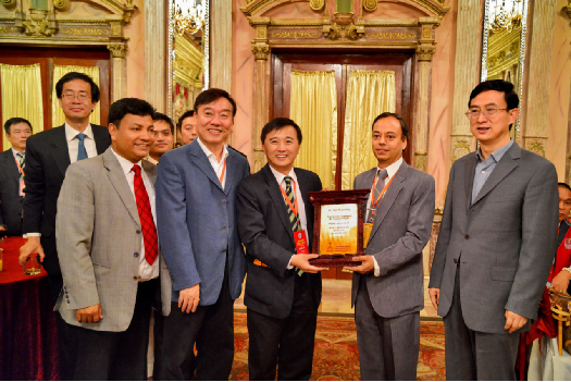 在中國駐尼泊爾大使吳春太先生(右一)舉行的答謝宴會上,尼泊爾阿尼哥協(xié)會主席Sarbottam Shrestha (右二) 向姚曉明博士頒發(fā)感謝狀。