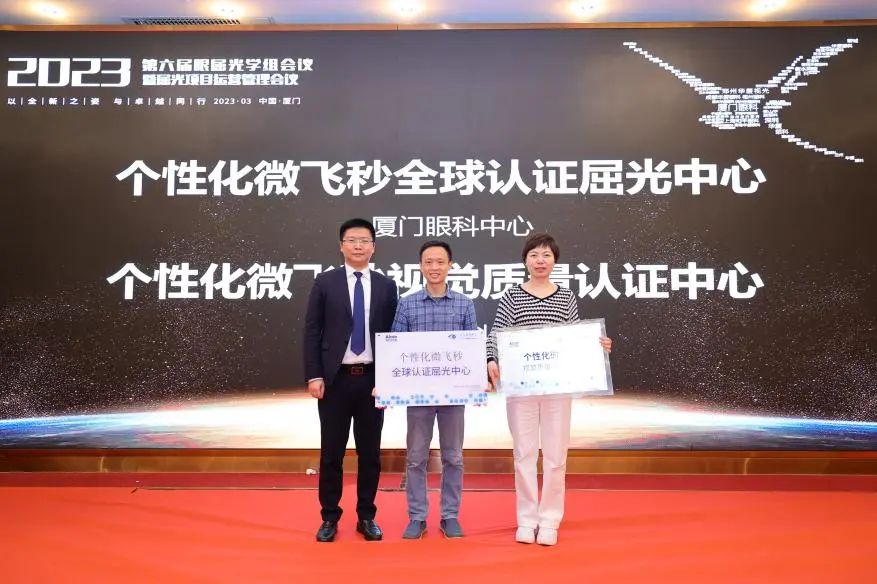 ▲ 愛爾康屈光產(chǎn)品事業(yè)部負(fù)責(zé)人王炯先生為廈門眼科中心頒發(fā)”個(gè)性化微飛秒全球認(rèn)證屈光中心“。
