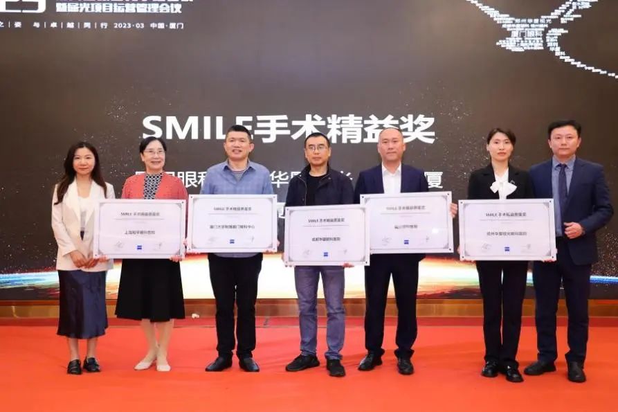 ▲ 蔡司醫(yī)療屈光大東區(qū)臨床應(yīng)用經(jīng)理伏小甜女士、蔡司醫(yī)療大客戶經(jīng)理陳偉先生為廈門眼科中心頒發(fā)“SMILE手術(shù)精益獎(jiǎng)”。