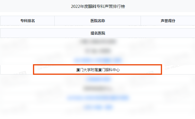 11月25日,由國內(nèi)著名同行專家擔(dān)任評(píng)審的復(fù)旦版《2022年度中國醫(yī)院綜合排行榜》和復(fù)旦版《2022年度中國醫(yī)院專科聲譽(yù)排行榜》在上海市發(fā)布。廈門眼科中心榮獲2022年度眼科??坡曌u(yù)排行榜提名,是全福建省唯一上榜的專科醫(yī)院,且已經(jīng)是廈門眼科中心連續(xù)第五年上榜!